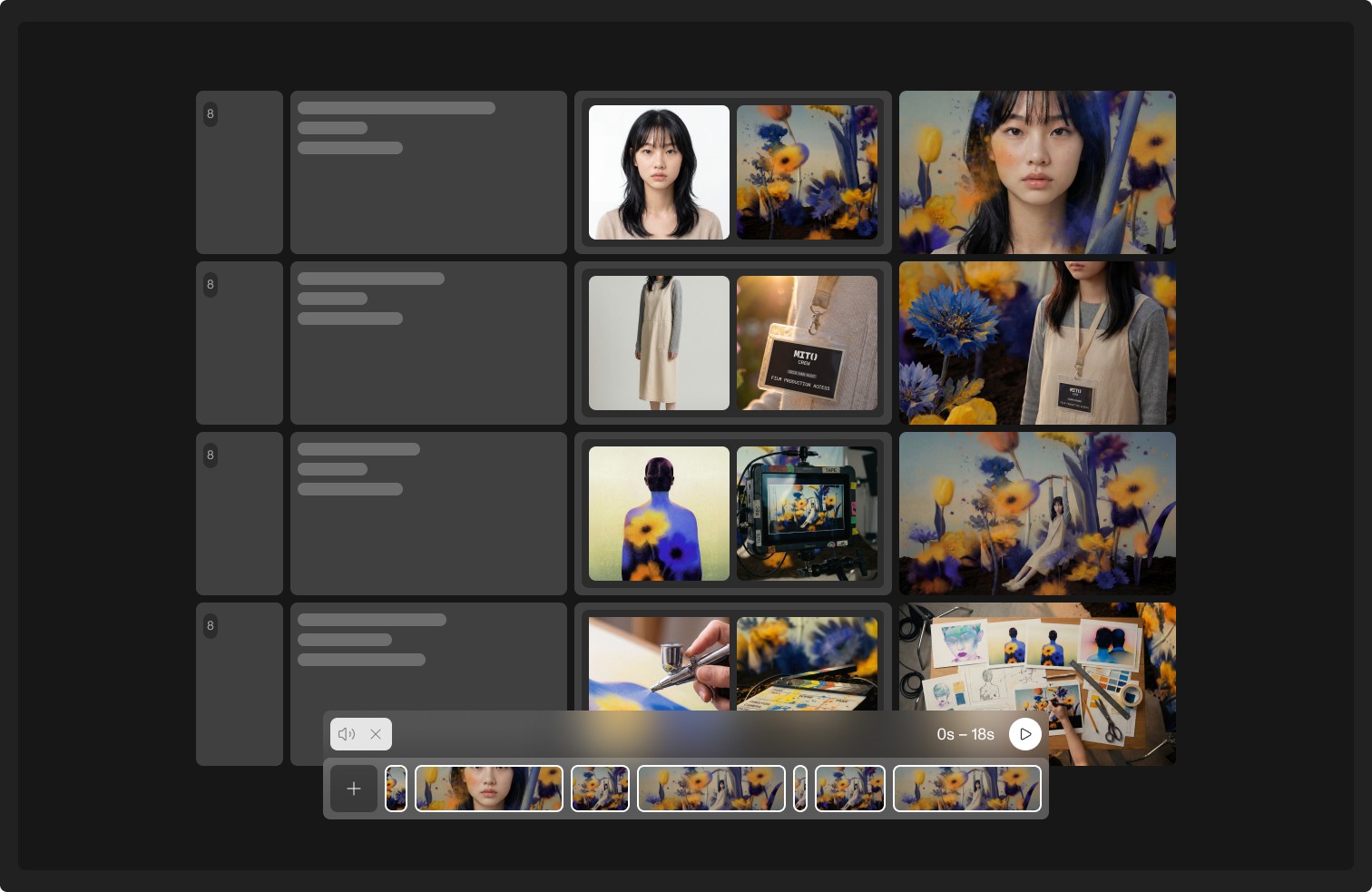 Storyboards that think. Shot-by-shot visuals with motion cues, style, and continuity. Regenerate any shot while preserving cast and brand identity.